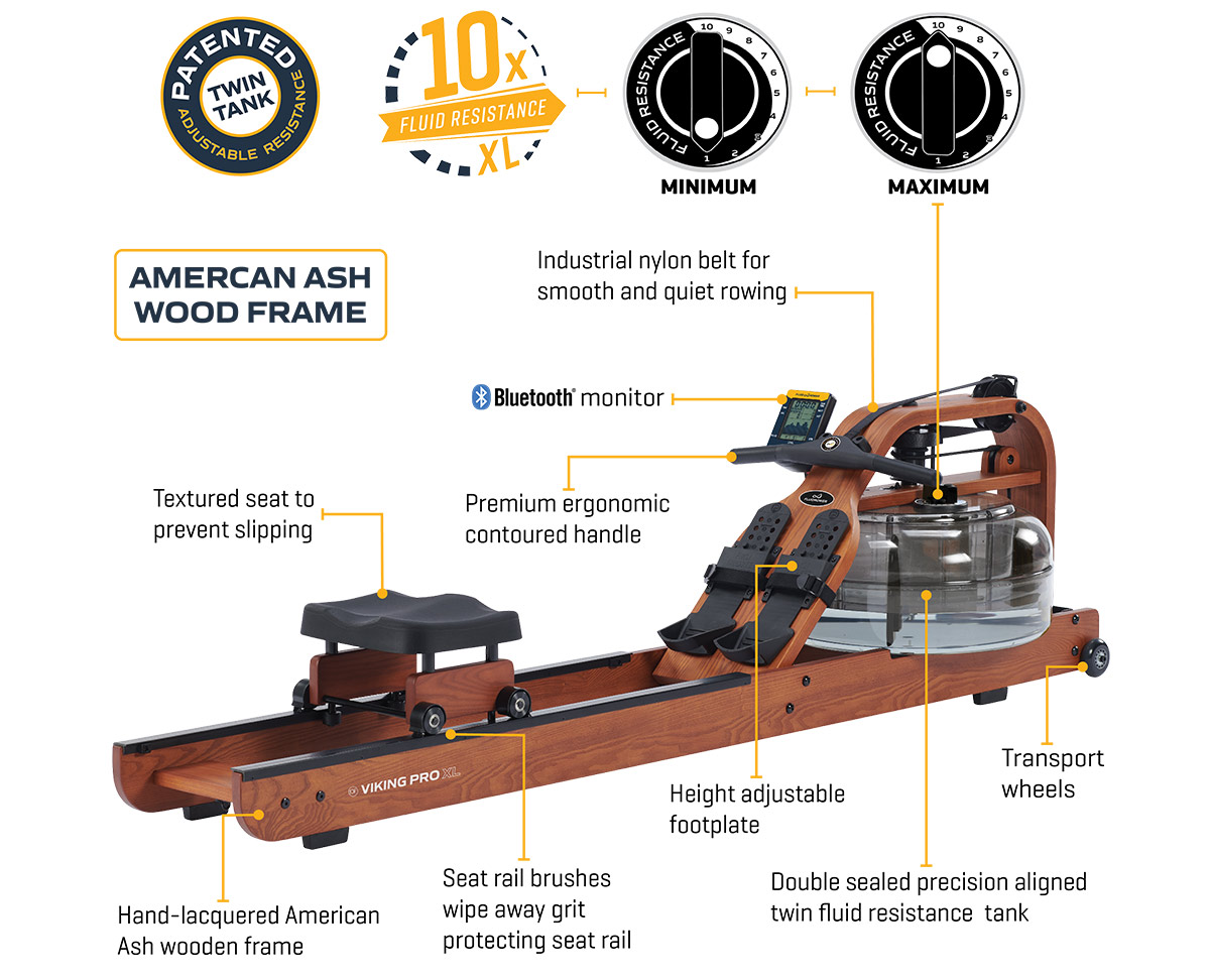 An extra-large patented twin tank is the driving force behind the powerful Viking Pro XL indoor rower, offering a colossal 65% greater resistance than standard FDF horizontal models.