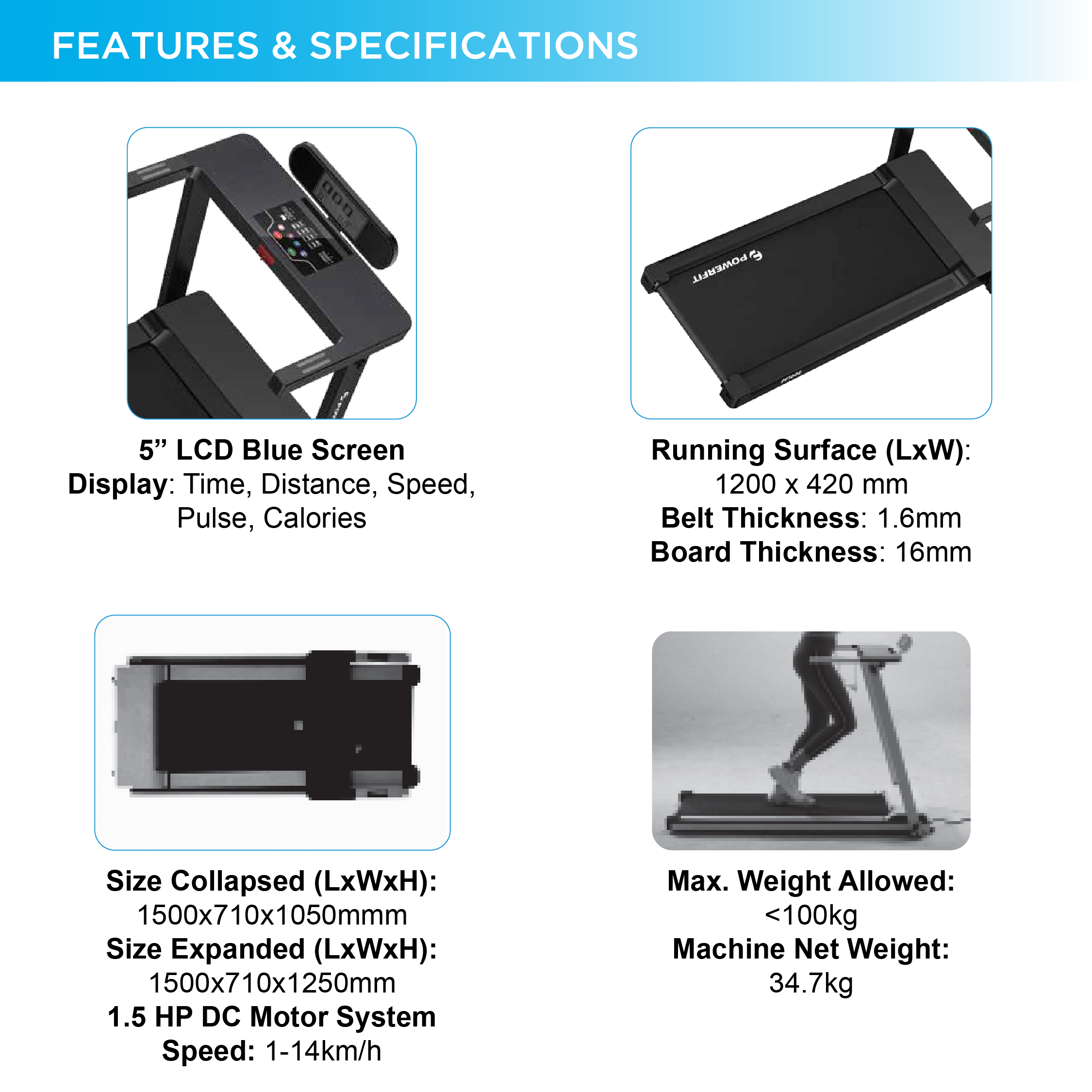 – Running Surface (L x W):1200 x 420 mm